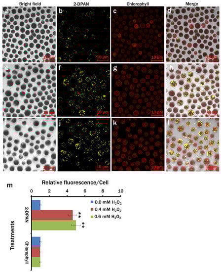 The confocal images also supported the results of the flow cytometry. More LDs were observed in the 2-DPAN labelled H2O2 supplemented cells (Figure 8), which were almost 5-fold and 4.6-fold higher in 0.6 mM H2O2 and 0.4 mM H2O2, respectively, than the control (0.0 mM H2O2) group (Figure 8m). Interestingly, despite a significantly higher amount of lipid accumulation (p < 0.01), there was not any noticeable change in the chlorophyll autofluorescence among the groups (Figure 8m).