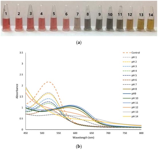 Figure 2a depicts the color change of anthocyanin at different pH buffers, as seen with the naked eye. As the pH rises from 1.0–6.0 to 7.0–10.0 to 11.0–14.0, the anthocyanin color changes from red to bluish-gray to yellow, respectively. This occurred due to anthocyanin structure alteration and the anhydrous base structural form [17]. The occurrence of red in acidic environments is caused by the dominant form of the original anthocyanin structure flavylium cation. According to a recent study, pH is one of the most important elements determining anthocyanin coloration because the ionic nature of molecules induces reversible or permanent changes in their structure depending on the pH [36].