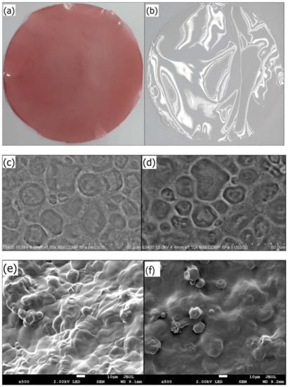 Figure 3a,b show the indicator and starch films, while Figure 3c,d show SEM micrographs of indicator and starch films, respectively. In comparison, the anthocyanin film has a homogenous surface, indicating that the components are well spread among each other [41]. By coupling hydrogen and electrostatic connections between anthocyanin hydroxyl groups and starch, anthocyanin enhances hydrogen bonding and improves film compatibility [17,42]. This means that anthocyanin is highly compatible with starch.