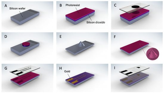 The designs were made in Tanner L-edit and transferred to a chrome mask by direct laser writing (Heidelberg Instruments uPG501, Heidelberg, Germany). For the 3D devices, the silicon wafers were initially cleaned for 20 min in a solution of sulfuric acid and hydrogen peroxide mixture (piranha cleaning). Silicon dioxide was deposited by plasma-enhanced chemical vapor deposition (PECVD), and a 1.6-μm-thick layer of positive photoresist (AZ5214E) was spin-coated onto the wafer, followed by a 2-min soft baking at 110 °C. UV exposure through a mask aligner was followed by 1 min developing in AZ726 to reveal a pattern of photoresist circles of 150 μm. The oxide layer not covered by the photoresist was removed by plasma etching to obtain the same pattern. Afterward, a non-passivated deep reactive ion etching (DRIE) was performed for 50 min. By applying SF6 alone and using the circle patterns as a hard mask, we obtained tip structures in a cone-like shape. To insulate these structures, 1 μm of silicon dioxide was deposited by thermal means (Figure 1A–E).