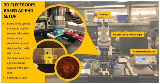 The electrodes were connected by their gold pads to a function generator (Agilent 33510B waveform Generator, Agilent Technologies, Santa Clara, CA, USA), and positioned under a fluorescence microscope equipped with a dual bandpass filter set (ET-FITC/CY3) and a 40× objective (Figure 2). A polydimethylsiloxane (PDMS) chamber of 0.4 mm thickness and 4 mm diameter aperture was placed on top of the electrodes to create a reservoir able to accommodate 15 µL of the bead solution (carboxyl functionalized Suncoast yellow fluorescent microsphere, average size 0.97 μm, ~2 × 109 beads per ml, dispersed in 1 mM of phosphate buffer saline (PBS)). The particle motion was captured on video by a camera (Blackfly S, BFS-U3-70S7C-C, 51 fps) connected on top of the microscope. The beads’ speed is estimated using NIH ImageJ and Trackmate plugin []. For biological assay experiments, 2D and 3D gold electrodes were first incubated with a 1-mM solution of cystamine dihydrochloride (Sigma Aldrich, St. Louis, MI, USA) for two hours []. After washing with de-ionized water and drying with nitrogen, electrodes were incubated in 3 mg/mL solution of EZ-Link sulfo-NHS-LC-biotin (Thermo Scientific, Waltham, MA, USA) in PBS for 3 h and finally washed with PBS to remove any unbound reagent []. Finally, the electrodes were incubated in a solution containing ~5 × 108 streptavidin-coated dragon green fluorescent microspheres of an average size of 1.04 µm (Bangs laboratories, Fishers. US), and ac-EHD parameters used for 2D and 3D devices were 100 Hz, 4Vpp. After that, the devices were washed with PBS, and imaging was carried out using a fluorescence microscope equipped with an FITC filter cube and a CCD camera (GS3-U3-91S6M-C, FLIR) for the excitation and imaging of the fluorescent beads.