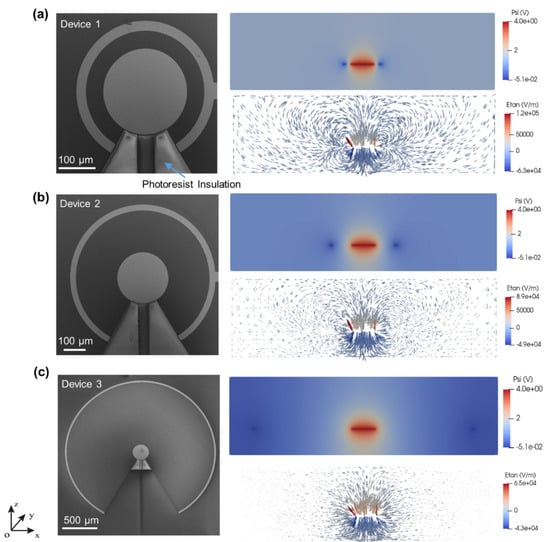 Figure 3 shows the SEM images of the three different 2D ac-EHD devices along with the electric potential and tangential electric field distribution of 2D devices on a cross-section of -xoz plane. SEM images clearly show the fabrication of three different 2D devices. The inner electrode diameter (i.e., 250 µm) and outer electrode width (i.e., 30 µm) are the same in all devices. Device 1, device 2, and device 3 have spacings of 50 µm, 200 µm, and 1000 µm, respectively. The arrow in Figure 3a shows the photoresist insulation to define the gold electrode.