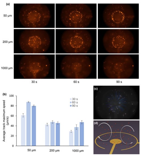 It can be seen that after 90 s of operation, fluorescent beads accumulated at the edges of device 1 and device 2. However, this accumulation of beads can hardly be found in the case of device 3. The beads accumulate at the edges of inner electrodes in devices 1 and 2 to compensate for the large electric field (Figure 3a,b). However, compared to devices 1 and 2, the electric field varies smoothly in the entire region in device 3 (Figure 3c); hence, less or no attachment of beads at the edges of the inner electrode. The phenomenon observed in these experiments correlated with the previous reports [,] and indicates the dominance of the dielectrophoresis, which seems to be minimal for the device with the largest distance between electrodes. Taking advantage of this benefit, device 3 will be more suitable for many sensor applications []. Furthermore, Figure 4b shows that device 1 has the highest average track maximum speed, while device 3 has the lowest speed since the dielectrophoresis (DEP) force on a particle is proportional to []. Previously, the beads’ average speed over the total period of time was used to characterize the fluid motion. In this study we adopted a different approach; ac-EHD was performed for 90 s at 4 V and 100 Hz for each device, and their average maximum speed was analyzed on intervals of 30 s (Figure 4b). This analysis gave an entirely new perspective about the fluid motion in the ac-EHD devices. Figure 4b shows that in device 1 (spacing of 50 µm), the fluorescent beads’ speed corresponding to the fluid motion increased in the first 30 s and reached its maximum value at 60 s and then further decreased at 90 s. The decrease in the fluid flow may be due to the beads’ accumulation at the edges of the electrode, which partly cover the electrode surface, resulting in the slow fluid motion. In device 2 (spacing of 200 µm), the speed of the beads was almost half the maximum speed attained by device 1; however, the fluid motion remained almost steady except for a slight drop in the speed at 90 s interval. In device 3 (spacing of 1000 µm), the fluid velocity increased steadily throughout the 90-s video and attained half the speed compared to device 1. Figure 4c,d show the snapshot from the particle tracking video (Video S4, Supplementary Materials) and schematic illustration of the fluid movement due to ac-EHD, respectively. The tracking of the fluorescent beads gave information about the movement of the fluid, as illustrated in Figure 4d. When the ac-field is applied on the electrodes, the product between the induced charges in the electrical double layer and the electric field’s tangential component results in a force perpendicular to the electrode [,]. Due to the electrodes’ asymmetry, larger forces are generated in the outer ring, dictating the fluid motion from the inner to the outer electrode []. The ac-EHD fluid flow can also be tuned by changing the electric field strength by selecting different amplitude (Vpp) and frequency (f) values []. In conclusion, device 1 gave the highest fluid mixing; however, the efficacy of fluid mixing decreased after 60 s. On the other hand, the fluid velocity increased steadily in case of device 3, indicating that the electrode spacing plays a crucial role both in the fluid mixing and emergence of the dielectrophoresis effect observed in device 1 and 2.