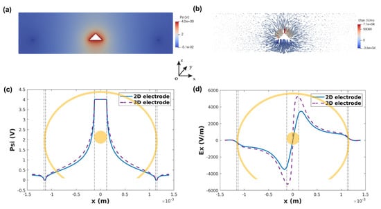 (a) Potential distribution and (b) tangential electric field distribution on the cross-section of -xoz plane. (c) 2D/3D potential comparison along x axis at z = 0 µm and (d) electric field comparison along x axis at z = 150 µm.
