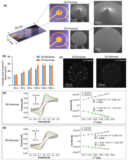 (a) Shows the schematic and SEM images of the 3D and 2D electrodes (inner electrodes). A single tip was formed in the middle of the inner electrode compared to the 2D electrode. (b) Comparison of the average maximum speed of 3D and 2D devices calculated in the intervals of 30 to 180 s. (c) Fluorescence images of 3D and 2D electrodes after the binding of streptavidin fluorescent beads onto the biotin-functionalized electrodes. The ac-EHD parameters used were 100 Hz, 4Vpp. (d,e, left) cyclic voltammograms were obtained using 0.1 M KCl containing 1 mM potassium ferrocyanide for 3D and 2D electrodes at different scan rates (10 mV/s to 100 mV/s). (d,e, right) present the plot current (I) vs. v1/2 for 3D and 2D electrodes, respectively.