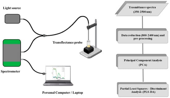 We used a portable spectrophotoradiometer system (FieldSpec 4™ Standard-Res Spectrophotoradiometer; ASD Inc., Boulder, CO, USA) to acquire transmittance spectra in the Vis-SWIR regions by means of a dip probe for performing liquid measurements in transflectance mode. Spectra acquisition was performed in controlled environmental condition.