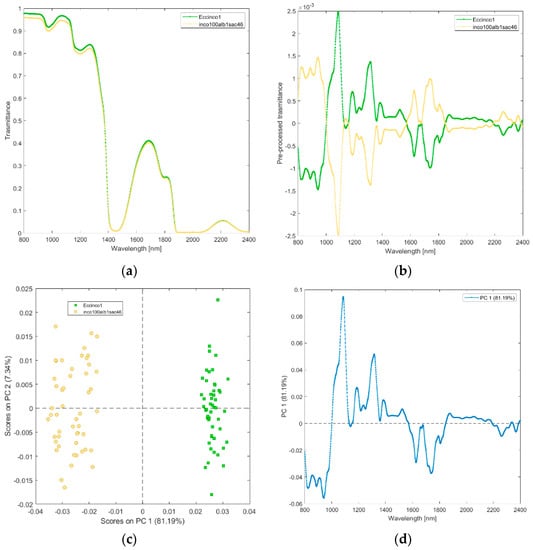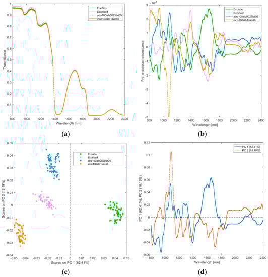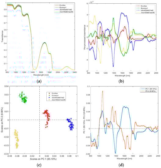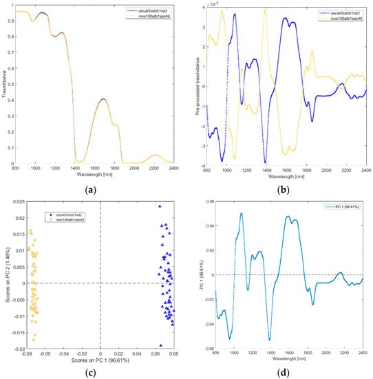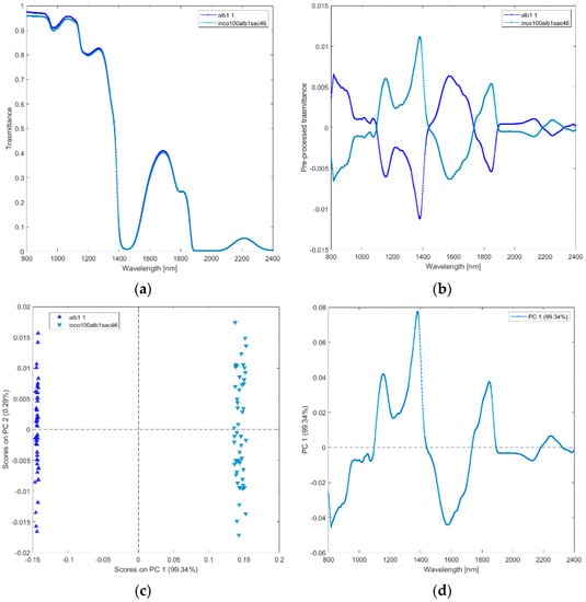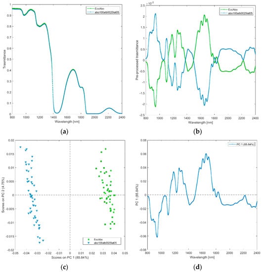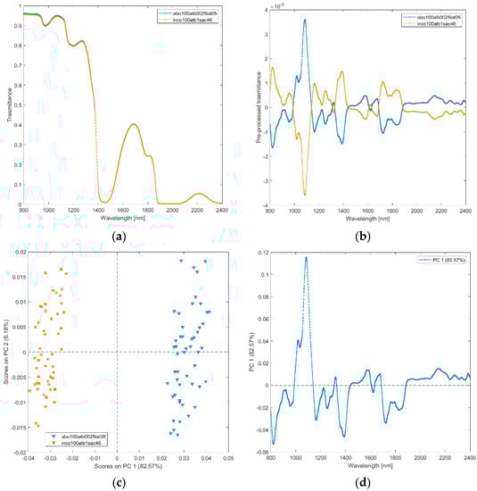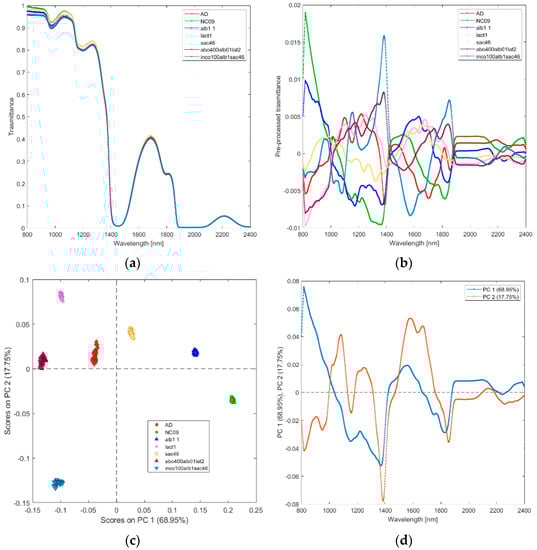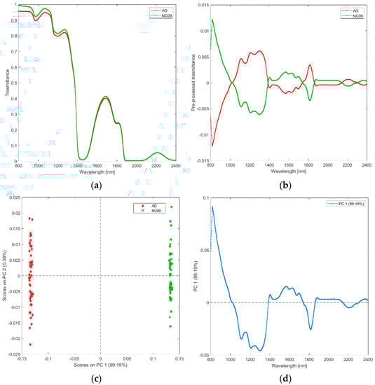 (x) Solutions of Saline (NC09), and water (AD). The raw and pre-processed transmittance spectra of saline and ultrapure water are shown in Figure 11a,b. PCA scores plot and loadings plot of the first principal components are shown in Figure 11c,d.