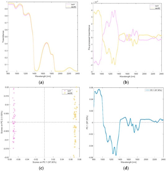 (ix) Solutions of lactose (lact1), and sucrose (sac46). The raw and pre-processed transmittance spectra of lactose and sucrose are shown in Figure 10a,b. PCA scores plot and loadings plot of the first principal components are shown in Figure 10c,d. PC1 captured 97% of the total variance. As shown in Figure 10c, the scores of lactose are in the negative space of PC 1 due to the wavelength ranges around 1000–1450 nm (mainly corresponding to water region associated with O-H stretching, the second overtone of CH and the first overtone combinations of CH; Figure 10d) and 1550–1850 nm (corresponding to CH, and the first overtone of CH), while the scores of sucrose are clustered in the positive space of PC 1.