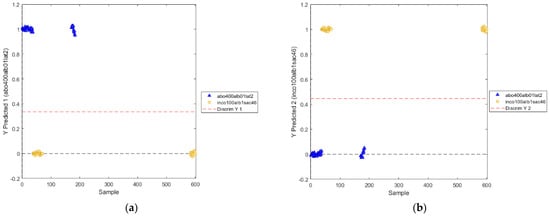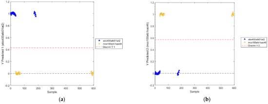 Positions of the discrimination boundary as determined by PLS−DA model (utilized wavelength ranges: 811–991 nm, 1018–1111 nm, 1352–1414 nm, 1527–1722 nm) for the two classes: abobotulinum A toxin (a) and incobotulinum A toxin (b).