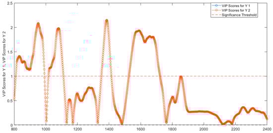 A second classification model was set up by using spectral values at wavelengths chosen by evaluating the variable importance in projection (VIP) scores of the first PLS-DA. The VIP scores are a metric of the importance of each variable in the projection used in a PLS model []. VIP scores < 1 are considered less important and were excluded from the model. This model was calibrated, cross-validated, and validated with the same approach used for the preceding models, using, in this case, 3 LVs.