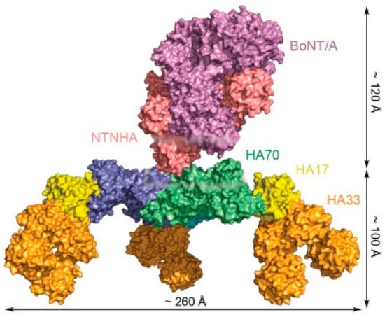 The main difference between the two studied commercial formulations of botulinum toxin is the presence of complexing proteins in the abobotulinum toxin A vial, whereas incobotulinum A toxin formulation contains the neurotoxin protein alone. In culture supernatants and naturally contaminated foods, botulinum toxin molecules are produced and exist as part of a protein complex termed the progenitor toxin complex (PTC), formed by the association of nontoxic proteins, a nontoxic nonhemagglutinin protein (NTNHA; 130 kDa) and three types of hemagglutinins (HAs) with molecular masses of 70, 33, and 17 kDa (HA-70, HA-33 and HA-17, respectively). Botulinum toxin and NTNHA form heterodimers, which constitute the minimal PTC (m-PTC, ~300 kDa), depicted by its crystal structure as a tight complex resembling interlocked hands. Together with the HA proteins, the heterodimer forms a large triskelion complex []. Three HA70s form the central hub; part of HA70 in complex with HA17 and two HA33s form the extended arm. This assembly takes place in steps: first m-PTC is formed, then three HA-70 molecules bind to form L-PTC (large-PTC), and finally, further conjugation of three HA-33/HA-17 trimers (a single HA-17 molecule plus two HA-33 molecules) onto L-PTC/HA-70 follows to produce the mature 750-kDa LL-PTC (extra-large PTC, tetradecameric model or triskelion complex, Figure 15). Therefore, supernatants contain neurotoxin moiety (~150 kDA) and a set of neurotoxic protein complexes, the m-PTC complexes (~300 kDa), the L-PTC complexes (~600 kDa), and the LL-PTC complexes (~900 kDa) []. Stabilized through noncovalent interactions, neurotoxin-associated proteins account for up to 70% of the total mass of the complex.