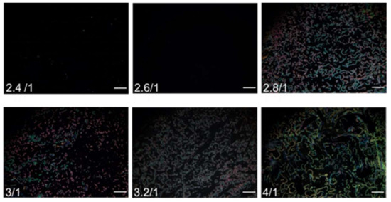 Optical texture of E7 on glass substrates coated with the PVA/DMOAP composite. The nematic LC E7 was sandwiched between two glass substrates coated with PVA/DMOAP mixtures of various mass ratios (2.4:1, 2.6:1, 2.8:1, 3:1, 3.2:1, and 4:1). Scale bar: 500 μm.