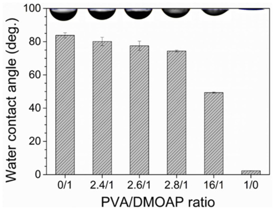 Water contact angle measured on glass substrates coated with the PVA/DMOAP composite. Glass substrates were coated with PVA/DMOAP mixtures of various mass ratios (0:1, 2.4:1, 2.6:1, 2.8:1, 16:1 and 1:0) and subjected to water contact angle measurements. Representative images of the water droplet at each PVA/DMOAP mass ratio are shown at the top of the chart. Error bars represent standard deviations calculated from at least three independent measurements.