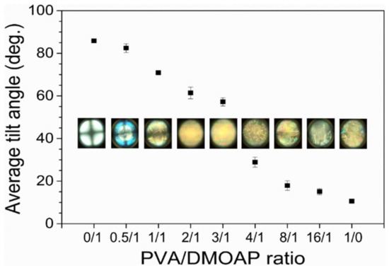 Average tilt angle of E7 as determined by capacitance measurements. The nematic LC E7 was sandwiched between two ITO-coated glass substrates covered with the PVA/DMOAP aligning agent. The average tilt angle was calculated by Equation (1) and plotted against the PVA/DMOAP mass ratio. Error bars represent standard deviations calculated from at least three independent measurements. Corresponding conoscopic micrographs at distinct PVA/DMOAP mass ratios are displayed for comparison.