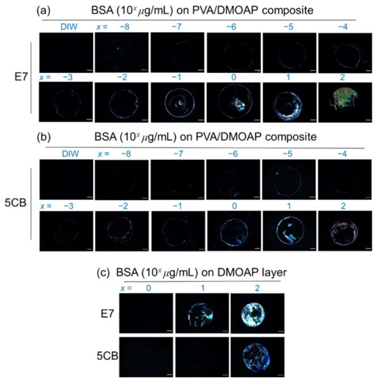 The PVA/DMOAP composite at a PVA/DMOAP ratio of 2.6:1 was employed in the detection of BSA, a protein standard with a molecular weight of 66 kDa (Figure 5). When observed under a POM, the lowest BSA concentration at which the optical response of E7 can be distinguished from the dark optical appearance in the presence of DIW was merely 10−8 μg/mL, and as expected, the brightness of the optical texture increased with increasing BSA concentration from 10−8 to 102 μg/mL (Figure 5a). The “coffee ring” seen in several of the POM images was due to uneven distribution of the solute (BSA) during solvent (water) evaporation, which was slower in the central liquid-vapor interface than on the rim of the droplet of BSA solution, leading to a radially outward capillary flow of BSA to the boundary area [32]. Compared with 5CB within the same BSA concentration range, the higher level of light leakage in E7 caused by BSA implies that E7 is more sensitive than 5CB to the change in the number of analytes at the LC-glass interface (Figure 5a,b). This is supported by our previous finding that LC of larger birefringence (E7 in this study) enhances signal amplification and sensitivity in biosensing by achieving higher transmitted light intensity (stemming from drastically scattered light owing to a more severe index mismatch in the LC bulk) between cross polarizers [8]. In comparison with E7, the narrow nematic temperature range of 5CB (23.6 to 35.2 ℃ for 5CB vs. −10 to 59 °C for E7) connotes that 5CB is prone to phase transition at ambient temperature. Besides, the effective birefringence of 5CB was also reported to be more temperature-sensitive, especially when approaching the nematic-to-isotropic transition temperature (Tc) [33,34]. Consequently, 5CB may not be a stable or suitable sensing material for the development of fast-screening or point-of-care devices desired to be accustomed to various climate zones unless in a temperature-controlled environment.