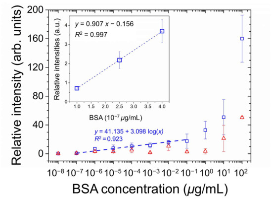 where s is the standard deviation of relative intensity at the lowest BSA concentration whose value is significantly higher than that at 0-g/mL BSA, and m is the slope of the linear regression line [37]. The relative intensity at the lowest concentration of BSA (10−7 μg/mL) was significantly higher than that of the DIW-only blank control. According to the inset of Figure 6, the LOD was calculated from the results of linear regression of the relative intensities at 1, 2.5, and 4 × 10−7-μg/mL BSA. The deduced LOD is 2.5 × 10−8-μg/mL BSA, which was nine orders of magnitude lower than that of LC-based biodetection exploiting an alignment layer consisting only of DMOAP.