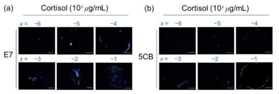 Optical texture of (a) E7 and (b) 5CB at various concentrations of cortisol on glass substrates coated with the PVA/DMOAP composite. Aqueous solutions of cortisol at various concentrations (10−6–10−1 μg/mL) were immobilized on PVA/DMOAP-coated glass substrates for LC-based detection with E7 or 5CB as the sensing medium. Scale bar: 500 μm.