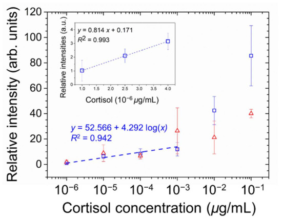 Quantitative analysis of the optical responses of E7 (open squares) and 5CB (open triangles) at various concentrations of cortisol on glass substrates coated with the PVA/DMOAP composite. The relative intensity of the brightness of the optical texture in Figure 7a,b were determined by the ImageJ software and plotted against the logarithm of cortisol concentration. The linear curve was illustrated in the inset to calculate the LOD. Error bars represent standard deviations calculated from at least three independent experiments. The dotted curve denotes the fitted regression line, with the coefficient of determination, R2, shown in the legend.