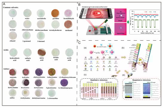 (A) Schematic of vapochromic transformation for the sensing of VOCs by Complex 1. (B) Illustration of the optofluidic automated 96-well LOC device. Incident light on the reaction chamber of the microfluidic device was captured by a camera, and the RGB value of ROI was analyzed with a smartphone. (C) Schematic diagram of smartphone-based GNPs and TRFMs-LFIAs for mycotoxin detection. (a) Preparation of immune probes; (b) detection principle of test strips; (c) qualitative test results with the naked eye; (d) quantitative test results with smartphones.