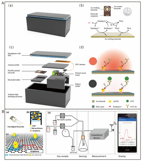 (A) Schematic diagram of smartphone-based ECL analysis device. (a) Three-dimensional (3D)-printing shell integrated with smartphone excluding ambient light. (b) Principle of Ru(dcpy)32+/TPrA-based ECL. (c) Details of the device in exploded view. (d) Diagram of ECL analysis for 3-nitrotyrosine detection. (B) Schematic diagram of smartphone-based sensor for VOC detection. (a) Photo of the interdigital electrodes. (b) Electrodes modified by graphene, ZnO, and nitrocellulose membrane. (c) Mechanism for detection of VOCs on the modified electrodes. (d) Schematic diagram of detecting procedures, including gas sample, sensing, measurement, and display on a smartphone.