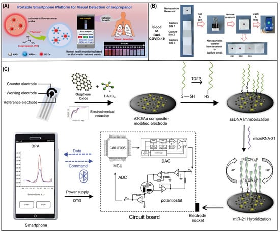 Schematic diagram for detection of IPA, IL-6, and microRNA using a smartphone. (A) Schematic diagram of the ratiometric fluorescence sensing system for IPA detection and RGB analysis of the fluorescent photo captured by the smartphone. (B) Diagrammatic representation of the paper immunosensor and analytical steps for detecting IL-6 in blood or respiratory samples (bronchial aspirate (BAS)) from COVID-19 patients. (C) Illustration of smartphone-based electrochemical biosensing system, including reduced graphene oxide/gold composite-modified electrode, circuit board, and smartphone with Android application.