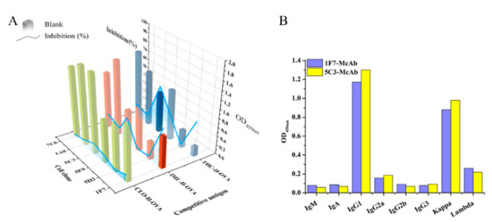 Characterization of antibodies from hybridoma supernatants. Screening hybridoma using ic-ELISAs with different competitive antigens. The concentration of competitive antigen was 5 μg/mL. The inhibition was tested with 50 μg/L of clothianidin (A). The isotypes determination of two antibodies (B).