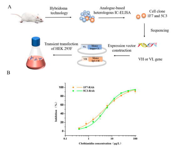 Cloning variable region genes of antibody from hybridoma for developing full-length IgG RAbs. Scheme of the production of full-length IgG RAbs (A). The inhibition curves of clothianidin were measured by antibodies based on heterologous ic-ELISAs (B). IMI-H-OVA-based heterologous ic-ELISAs for 1F7-RAb (1.25 μg/mL of IMI-H-OVA). THC-H-OVA-based heterologous ic-ELISAs for 5C3-RAb (5 μg/mL of THC-H-OVA).