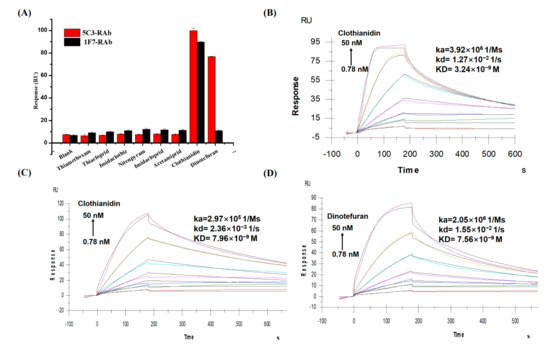 Ideally, SPR-based direct analysis was good for studying the interaction between the antibody and the analyte itself. For the binding selectivity assay, as shown in Figure 3A, the 1F7-RAb only showed a high signal towards clothianidin, whereas the 5C3-RAb showed a high signal towards both clothianidin and dinotefuran, which was consistent with the results of the ic-ELISAs. For the kinetic evaluation, the 1F7-RAb exhibited higher affinity (KD = 3.24 × 10−9 M; Figure 3B) towards clothianidin than the 5C3-RAb (KD = 7.96 × 10−9 M; Figure 3C). In addition, 5C3-RAb showed a similar affinity to both clothianidin and dinotefuran (KD = 7.56 × 10−9 M; Figure 3D). By comparison of the kinetic parameters (ka, kd), the immunocomplexes of clothianidin and 5C3-RAb dissociated slower than that of dinotefuran and 5C3-RAb, indicating that the binding of 5C3-RAb to clothianidin was more stable than that to dinotefuran, which could be responsible for the IC50 value of 5C3-RAb to clothianidin being lower than to dinotefuran in the ic-ELISAs.