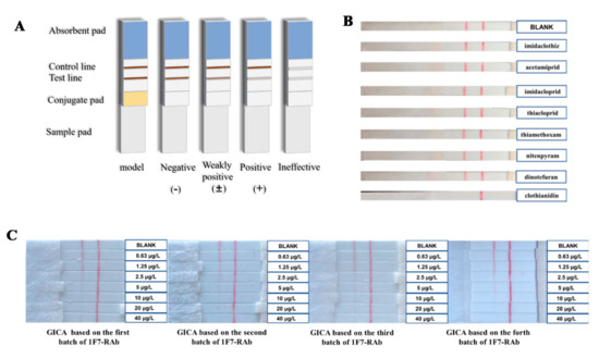 The lowest concentration of clothianidin that caused the markedly weaker color of the T line was regarded as the visual assay sensitivity. As shown in Figure 4C, when the concentration of clothianidin increased, the color of the T line became weaker and faded further. Compared to the blank control and the C-line, when clothianidin was 2.5 μg/L, the T line had an obvious color fade, and when clothianidin was more than 10 μg/L, the T line was invisible. The results indicated that the visual detection limit (LOD) of clothianidin by the GICA was 2.5 μg/L, and this method can be used for a semi-quantitative determination of clothianidin at three concentration intervals: <2.5 μg/L (negative, −), 2.5−10 μg/L (weakly positive, ±), and >10 μg/L (strongly positive, +). Compared to a previous report on the GICA for clothianidin detection with a visual LOD of 8 μg/L [35], we developed a more sensitive and specific GICA for the rapid test of clothianidin. In addition, multiple batches of the GICA based on different batches of the 1F7-RAb had the same sensitivity (Figure 4C), indicating the full-length IgG RAb-based GICA can be repeated and is suitable for standard production and commercialization.