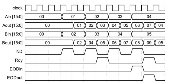 Waveforms of inputs and outputs for the combiner module. The Aout and Bout combine two consecutive values from Ain and Bin. The Rdy signal is active high every two valid ND pulses.