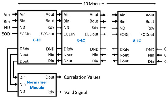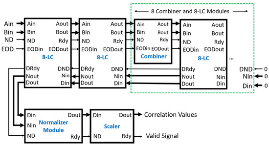 A cascaded connection of multiple SLC modules allows for the direct formation of a linear correlator module of multiple values. For example, 8-LC is formed by chaining eight SLC modules together with the connections shown in Figure 3. The outputs of Aout, Bout, Rdy, and EODout of the previous SLC module are connected to inputs of Ain, Bin, ND, and EODin of the current SLC module. The outputs of Dout, Nout, and DRdy of the current SLC module are connected to the inputs of Din, Nin, and DND of the previous SLC module. That effectively creates three shift register chains using the registers of DReg, NReg, and DRdyReg in the eight SLC modules. When the EODin signal arrives, the values in the accumulators, the count values, and their valid signals are copied to their respective registers. The data in those registers are shifted out from the first module in series. For the last SLC module, its inputs of Din, Nin, and DND are the inputs of Din, Nin, and DND of the 8-LC module. Its output of Aout and Bout are the outputs of Aout and Bout of the 8-LC module.