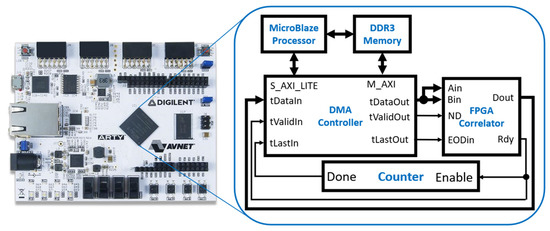 Figure 11 is the block diagram of the test bench design. The DMA controller is an AXI DMA module available in Vivado and has one write channel and one read channel. The write channel has the data port (tDataOut), data valid signal (tValidOut), and the last data indicator (tLastOut). They were connected directly to the data port (Ain and Bin), Nd, and EODin of the FPGA correlator, respectively. The outputs of the FPGA correlator were connected to the read channel of the DMA controller with the Dout connected to tDataIn and Rdy signal connected to tValidIn. The counter counts the Rdy pulses, and its output (Done) goes active high when the counter value reaches 80, the total number of output correlation values. The Done signal is connected to the tLastIn of the read channel. M_AXI is the data port of the DMA controller and S_AXI_LITE is the configuration port of the DMA controller.