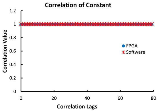The size of the three data series was 1000 data points each. The first set was a series of constant values of 1. The results from this input for both the FPGA and software correlators are shown in Figure 12. Both the FPGA and software correlators output the identical result of 1 for all of the lags, as expected for the given input. That can be easily validated using Equation (1).