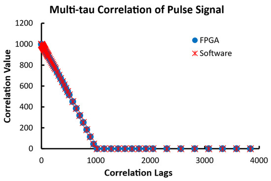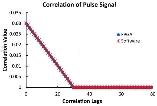 The second data set was a pulse with a value of 100 for the first 1000 data points and 0 for the remaining 9000 points. As shown in Figure 15, both the FPGA and software implementations output identical results for every delay. Similar to the case in the linear correlator, the theoretic value of the correlation when n is less than 1000 is listed in Equation (7) and zeros for other correlation values. Therefore, the correlation value at zero-lag should be 1000, as shown in Figure 16.