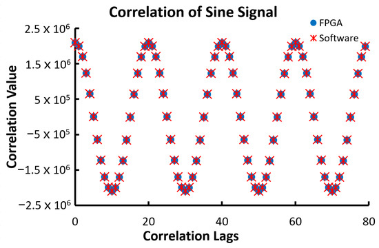 The third data set was a sine signal with a period of 4000 data points and a total size of 20,000 data points. This allows the correlator output to cover the entire cycle of the correlation. The larger data size reduces the windowing effect caused by the finite data size. The amplitude of the sine signal was 31 and the initial phase was zero. Thus, the correlation should be a cosine function with an amplitude of 480, as shown in Equation (6). Figure 17 shows the output from both the FPGA and software correlators; both outputs matched perfectly.