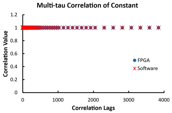 The test of the multi-tau correlator used 10,000-point data sets for the multi-tau correlation of the constant signal and the pulse signal. Since the unit time lag is doubled every eight lags after the initial 16 correlation lags, the last lag from the correlator is at 3840 when the initial lag is used. The large data size allows for the calculation of the correlation at much larger lags. The first data set was a series of constant values of 1. The results from this input are shown in Figure 15. The output of the 80 correlation values in the figure shows the increase in the correlation lag. As expected, both the FPGA and software returned the identical result of 1 for all lags.