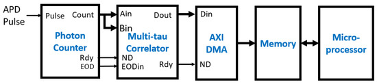 - Liu, W.; Shen, J.; Sun, X.M. Design of Multiple-tau Photon Correlation System Implemented by FPGA. In Proceedings of the 5th International Conference on Embedded Software and Systems, Chengdu, China, 29–31 July 2008; pp. 410–414. [Google Scholar]