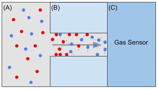 Basic operating principle for microfluidic electronic nose devices. Unlike electronic noses discussed in Section 2, the sensor array has been replaced with a single sensor coupled to a microfluidic channel. (A) Headspace sample containing a mixture of so analytes, red and blue. (B) Sample flows through microfluidic channel due to diffusion processes. Separation occurs due to adsorption on the channel walls. (C) Compound with the lowest retention time (time spent within the channel) will reach the gas sensor. This provides the user with a curve with features specific to the mixture of gases within the sample allowing for discrimination [84].