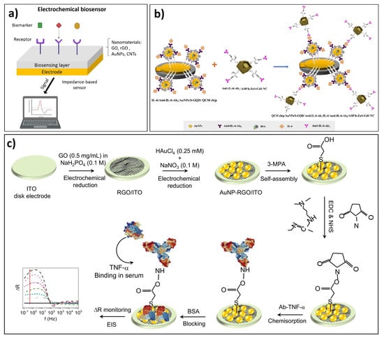 Electrochemical biosensors. (a) Schematic illustration of the general design of an impedance-based biosensor. (b) Surface design of a sandwich-type electrode biosensor based on functionalized sulfur-doped GQD for IL-6 detection. (c) Design and manufacture of ITO disk electrode for biosensing of TNF-. Source: (b,c) reproduced from [127,128] with permission of Elsevier.