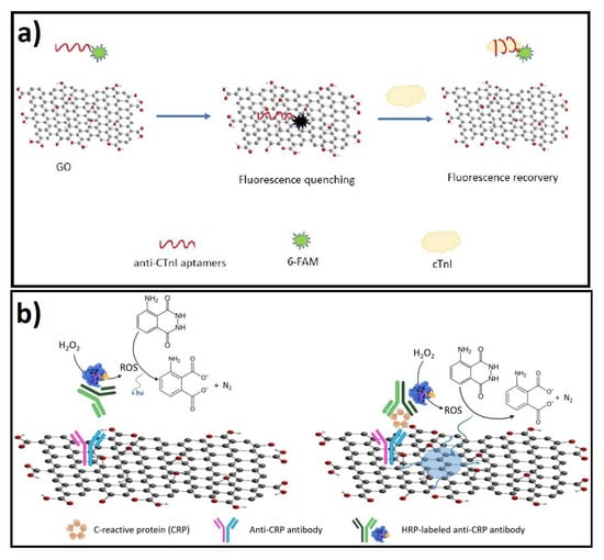 On the other hand, several reports have shown the detection of additional relevant protein biomarkers related to inflammatory diseases, such as cTnI, as a critical biomarker of acute myocardial infarction detected by CV [156,157], EIS [158,159,160,161], DPV [162,163,164], amperometry [165], and ECL [166,167,168]. In these examples, the reached LOD was lower than 1 pg/mL in clinical serum samples. Furthermore, in the last years, a significant improvement for cTnI detection was achieved by Gou and colleagues by synthesizing a functionalized GQD to be integrate into a label-free ratiomeric ECL immunosensor for the sensitivity detection of cTnI, which allowed researchers to reach LOD of 0.35 fg/mL in buffer solution and around 3.2 pg/mL in clinical human serum samples; selectivity of the immunosensor was evaluated with relevant interfering proteins such as Mb, hFABP, BSA, HAS, and IgG [168].