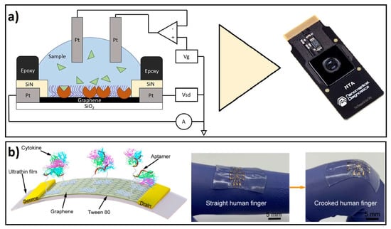 - Hao, Z.; Wang, Z.; Li, Y.; Zhu, Y.; Wang, X.; De Moraes, C.G.; Pan, Y.; Zhao, X.; Lin, Q. Measurement of cytokine biomarkers using an aptamer-based affinity graphene nanosensor on a flexible substrate toward wearable applications. Nanoscale 2018, 10, 21681–21688. [Google Scholar] [CrossRef] [PubMed]