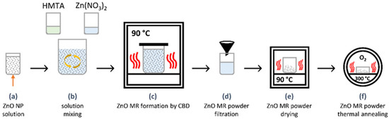 ZnO MRs were grown by chemical bath deposition (CBD) following and adapting a methodology reported in Refs. [36,37]. Commercially available suspended undoped ZnO nanoparticles (NPs) with a diameter lying in the range of 80–100 nm (Sigma-Aldrich) were used as nucleation seeds. The fabrication process of ZnO MRs is detailed in Figure 1. ZnO NPs with a mass of 240 mg were first dispersed in 100 mL of deionized water with the help of ultra-sonication for 30 min and second homogenized (Figure 1a). The ZnO NP solution was mixed with two separate precursor solutions composed of zinc nitrate hexahydrate (Zn(NO3)2·6H2O, Sigma-Aldrich, Burlington, MA, USA) and hexamethylenetetramine (HMTA, Sigma-Aldrich) in deionized water using an equimolar concentration of 30 mM (Figure 1b). The resulting CBD solution was stirred for 15 min and put in a sealed reactor. The sealed reactor was placed for 16 h in an oven kept at 90 °C (Figure 1c). The white powder composed of ZnO MRs was subsequently separated from the supernatant by vacuum filtration using a 0.1 µm pore membrane nitrocellulose filter (Whatman®, WHA7181004, MERCK, Darmstadt, Germany) (Figure 1d). washed with deionized water, and dried in an oven kept at 90 °C (Figure 1e). Thermal annealing was eventually performed for 3 h at 300 °C in a tubular furnace under oxygen atmosphere (Figure 1f).