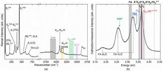 (a) Raman spectrum acquired on an array of undoped ZnO MRs grown by CBD and annealed for 3 h at 300 °C under oxygen atmosphere. The insets delimit the calculated and experimental vibrational frequencies from Raman and infrared absorption spectroscopy as deduced from Refs. [38,39,47,49,51,52,53]; (b) 5 K cathodoluminescence spectrum acquired on a single undoped ZnO MR grown by CBD and annealed for 3 h at 300 °C under oxygen atmosphere with a special emphasis on the NBE emission region. The insets represent the emission energy of optical transitions as deduced from DFT calculations and from experimental data in Refs. [38,39,54,55].