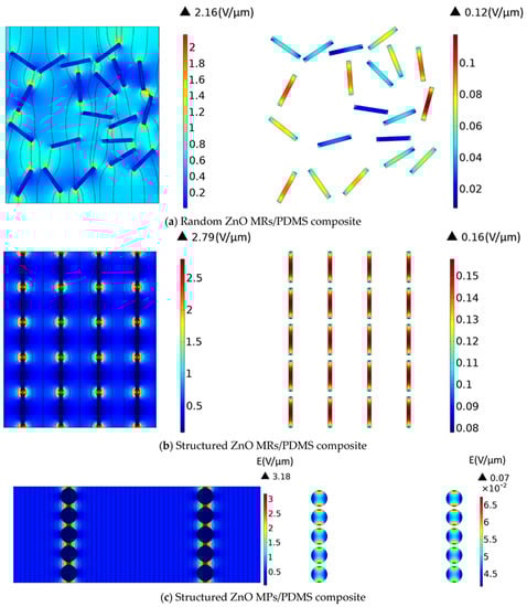 Electric field distribution in the three composites loaded with 8% volume fraction of ZnO fillers, all subjected to the same external excitation of 0.5 V/µm: (a) Random ZnO MRs/PDMS; (b) Structured MRs ZnO MRs/PDMS; and (c) Structured MPs ZnO MRs/PDMS. Two pictures are shown in each subfigure; the one on the left-hand side gives an overview of the whole composite, while the other on the right-hand side provides a closer view of the fillers. Both are not on the same color scale, for an easier visualization.