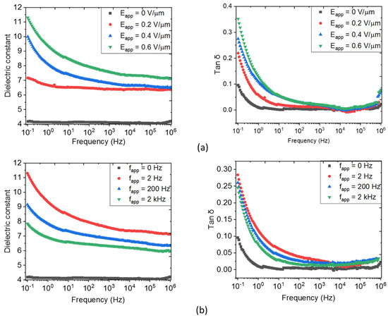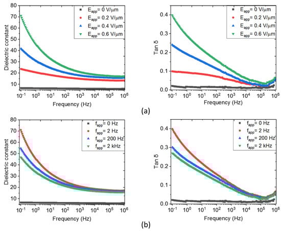 Broadband spectroscopy of an 8% vol. ZnO MP composite under different parameters of the applied electric field: (a) Varied amplitude and fixed frequency to 2 Hz; and (b) Varied frequency and fixed amplitude to 0.6 V/µm.