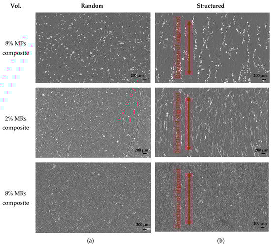 SEM images of (a) Random and (b) Structured composites integrating 8% vol. MPs, 2% vol. MRs and 8% vol. MRs under an applied electric field (, ) during the DEP process (the scale bar is 200 µm).