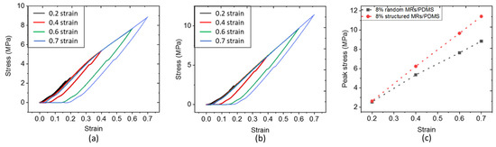 Compressive stress–strain curves of the 8% vol. (a) Random and (b) Structured ZnO MR/PDMS composites; (c) Peak stress versus strain for the 8% vol. random and structured ZnO MR/PDMS composites.