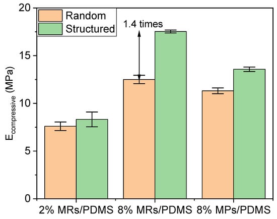 Firstly, the mechanical properties are discussed for the set of all samples due to their contributions to the piezoelectric behaviors. Figure 9a,b indicate the compressive stress–strain curves of the random and structured 8% vol. MR/PDMS composites, respectively. The composites experience a stepped loading profile, in which a series of fixed strains (including 0.2, 0.4, 0.6, 0.7) is exerted. After reaching the maximum value, unloading processes are conducted for a given deformation of the specimen. Both random and structured composites undergo a complete recovery, demonstrating how strong and flexible mechanical characteristics of the developed composites are. For a better evaluation of the compressibility, the peak magnitude of stress with the associated peak magnitude of strain are plotted in Figure 9c to derive the compressive elastic modulus (Ecompressive). As seen in Figure 10, Ecompressive of the structured (i.e., aligned) composites is enhanced and strengthened as compared to the random one, since the compressive load lies in the same direction as the applied electric field during the DEP process. In other words, the chain-like structure of the fillers makes the whole system stiffer in that direction. Among them, the alignment on the 8% vol. MRs-based composites during the DEP process can achieve 1.4-fold improvement as opposed to the random one. Additionally, under a volume fraction of 8%, composites of rod-shaped fillers are much stiffer than those of spherical-shaped fillers. Such an improvement is specifically evident for the Young modulus of the structured composites (~17.5 MPa), manifested by a better alignment of fillers, which in turn contributes to their excellent piezoelectric behavior.