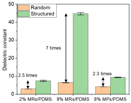 Dielectric constant measured at 1 Hz for different random and structured (i.e., aligned) ZnO MR/PDMS and MP/PDMS composites.