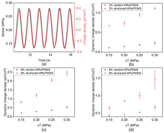 The piezoelectric behaviors of the composites were subsequently characterized by measuring the generated charge density () in response to an external oscillating stress () of 0.15 MPa magnitude and 1 Hz frequency. Figure 12a displays the time evolution of and for the structured 8% vol. MR/PDMS composites, reflecting the linear electromechanical coupling of a typical piezoelectric material. A small phase shift is found between and , which may be due to the detection delay or the restore/discharge mechanism of the capacitive sample. To better highlight the linear relationship between the electrical output and the mechanical input, Figure 12b–d illustrates the charge density variation (∆D) as a function of the dynamic stress variation (∆T) for the whole set of samples. The piezoelectric coefficient (d33) can be accurately deduced from the linear fitting of the ΔD-versus-ΔT characteristics, i.e., corresponding to the slope of the linear regression, as presented in Figure 13. These results confirm three possible approaches that can be used to improve the material performance: